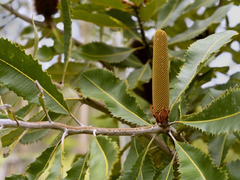 Banksia robur or Swamp Banksia is a fast-growing Native Australian Shrub and is super adaptable to most garden situations. This little guy is called the Swamp Banksia because it is naturally found in damper parts of the bush. In the garden, he will handle a damp, boggy spot but will also adapt to suit those drier conditions. The leaves of this beautiful shrub are large glossy green on top and light green underneath with serrated edges. Large blue/green flower spikes appear from January to July and turn to a golden yellow when mature. He’s a fast grower and will get to 1.5m tall in three years.