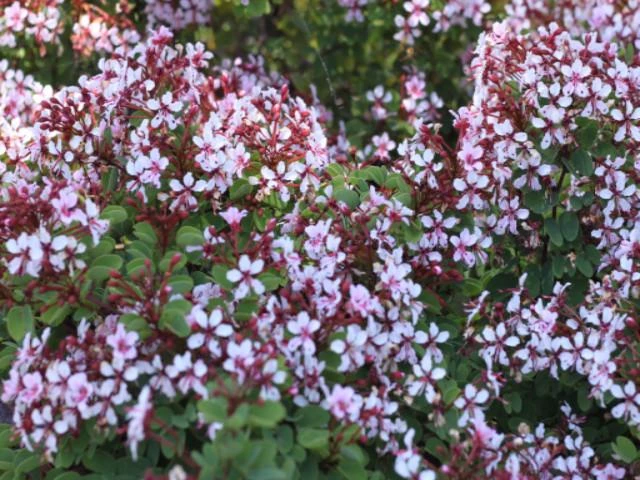 Bauhinia corymbosa was previously known as Bauhinia scandens and commonly known as Climbing Bauhinia or Climbing Butterfly Bush. It is an evergreen, climbing/trailing plant bearing loose clusters of pinkish-rose flowers in Spring and Autumn. The leaves are small, bright green and butterfly-like (folding into two), arranged on slender arching stems.