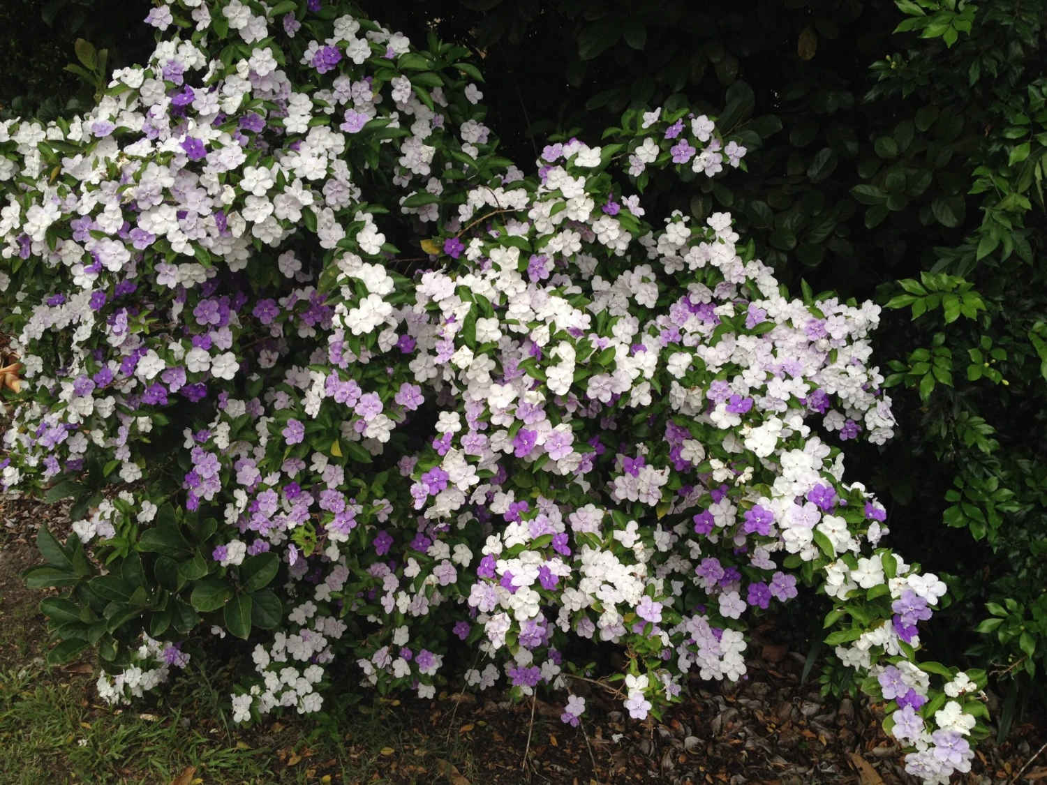 Brunfelsia latifolia ‘Sweet Petite’ is a dwarf variety of an old favourite also known as “Dwarf Yesterday, Today and Tomorrow“. The sweetly perfumed flowers change colour over successive days, opening as purple, fading to lilac and then finally to white. As the three different coloured flowers are present at the same time, a fabulously colourful display is created.