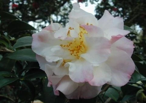 Camellia japonica Erin Farmer is a beautiful flowering shrub with glossy green leaves and large white semi-double petals that have touches of blush pink.