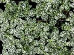 Fittonia verschaffeltii Starlight also goes by the name of Nerve Plant, Mosaic Plant and Painted Net Leaf. Originally from rainforests in South America, this baby likes a nice humid spot in the house with plenty of nice bright, indirect sunlight.