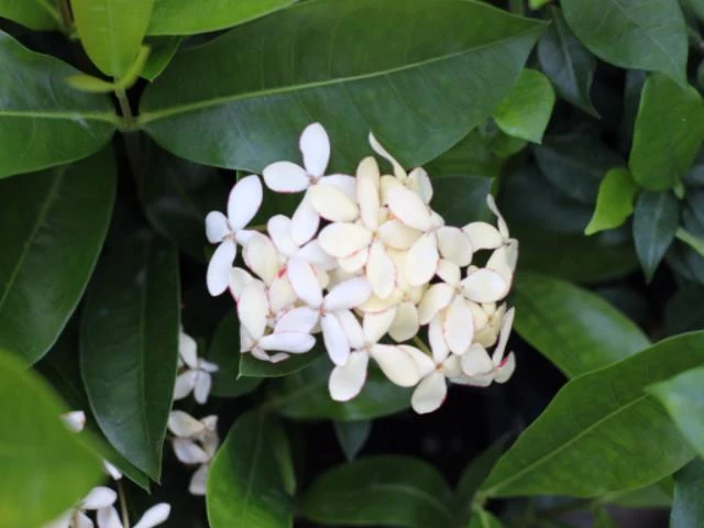 Ixora White Malay is a snowy-white shrub that shows off bright white balls of bloom with a tinge of pink edging in the summer.