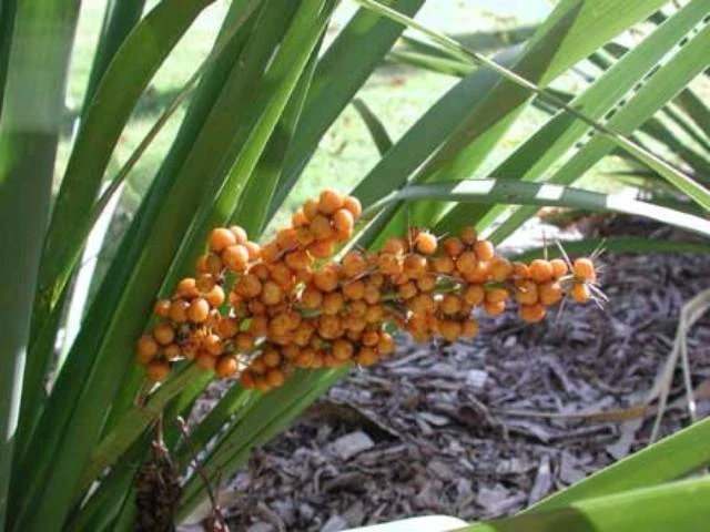 She has flat green tufted leaves that can reach 80cms long and produces clusters of brilliant orange-coloured fruit in summer. She prefers damp soil, and if you can give her a well-watered spot she’ll reach a metre in width.
