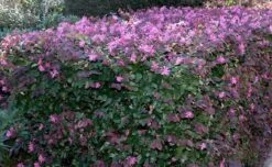 Ooooh – check out China Pink, she’s a real babe with lolly-pink fringed flowers in spring and summer that are arranged on delicately weeping stems of dark burgundy-coloured evergreen leaves. This plant creates a very pretty hedge whether in flower or not.