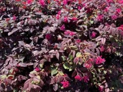 Loropetalum Chinense Bobz Red (dwarf) is a highly hardy evergreen dwarf shrub with burgundy oval-shaped foliage. In spring, red and hot-pink, fringed flowers appear and cover the whole plant from compact tip to toe.
