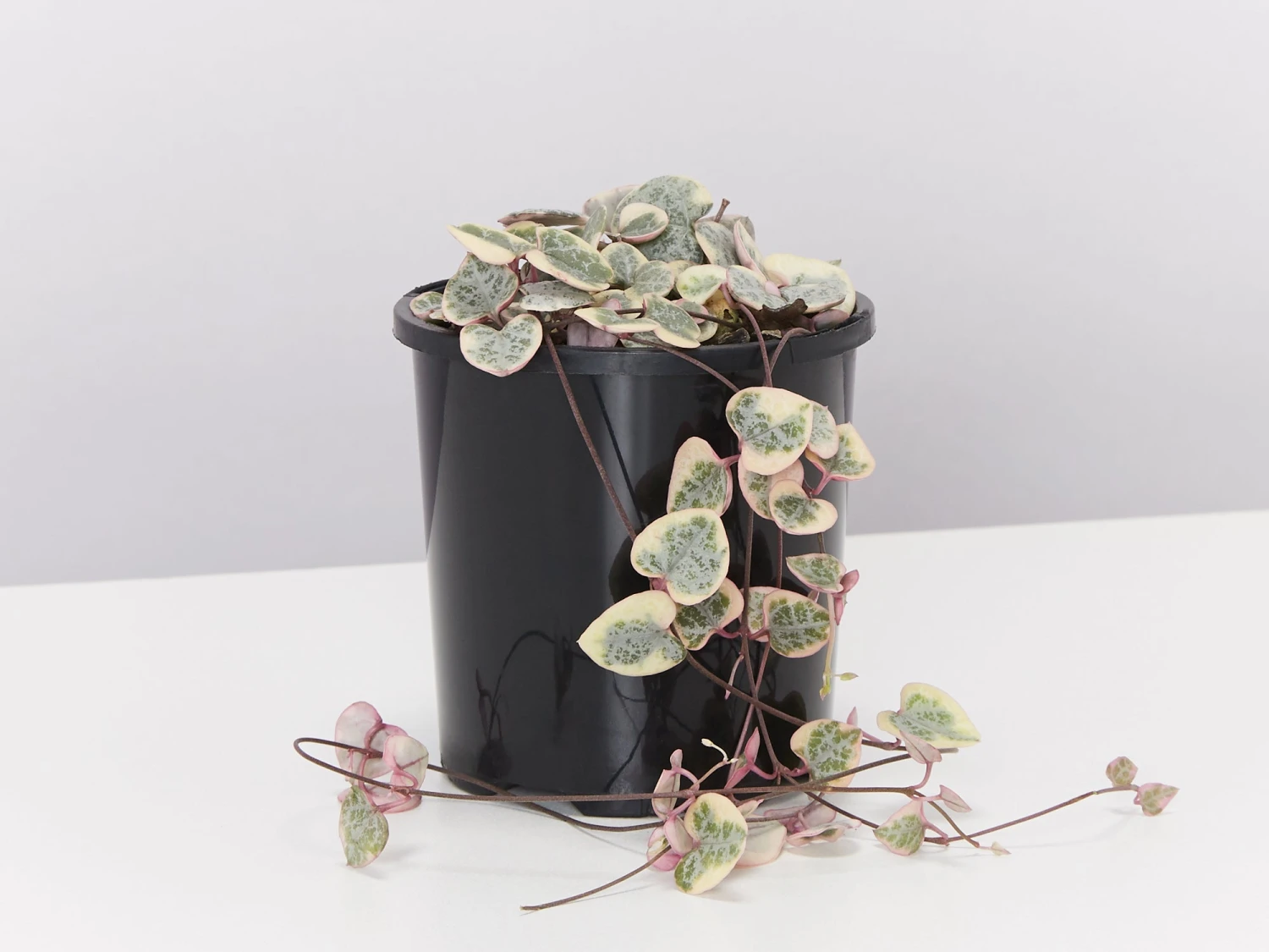 “Ceropegia Woodii Variegata” Oh the rarity of it all. A variegated version of Chain of Hearts (or sometimes called String of Hearts). A cute little heart-shaped leaf of pink, cream leaves with splashes of lime green and grey. She’s quite the lady! A delicate trailing plant. Her colours will change with the seasons, and the intensity of light and her leaves will grow on long vines.